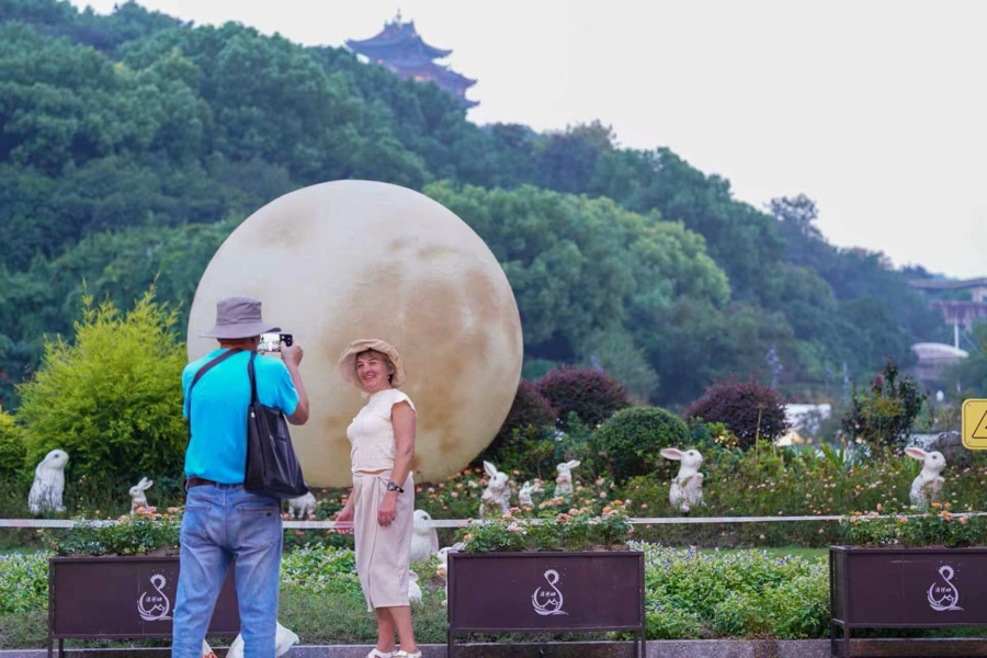 国庆长假期间,位于杭州吴山广场的吴山花海里打造的一处中秋主题灯饰,成为杭州的热门打卡点之一。一轮直径3米的“超级月亮”与一群萌趣“玉兔”出现在草坪上,以其白天的“月球形态”与夜晚的“皎皎满月”绚烂造型,吸引了许多市民游客前来,共赏这轮提前升起的“吴山明月”,沉浸在浓郁的双节氛围之中。