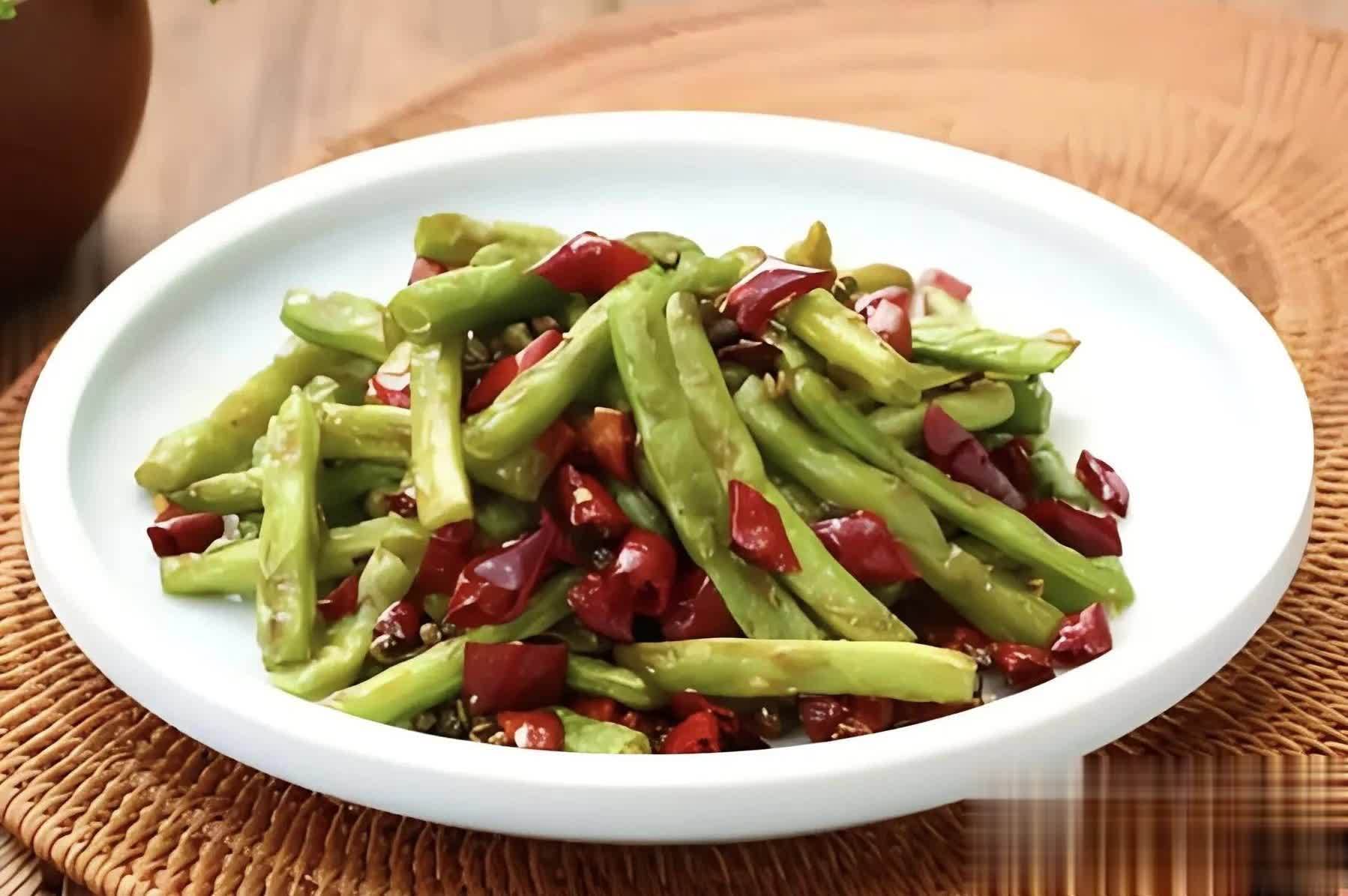 2. 焯水四季豆:将四季豆放入沸水中焯水,水开后煮约2-3分钟,捞出沥干水分,备用。这样可以去除四季豆的涩味,保持色泽鲜绿。