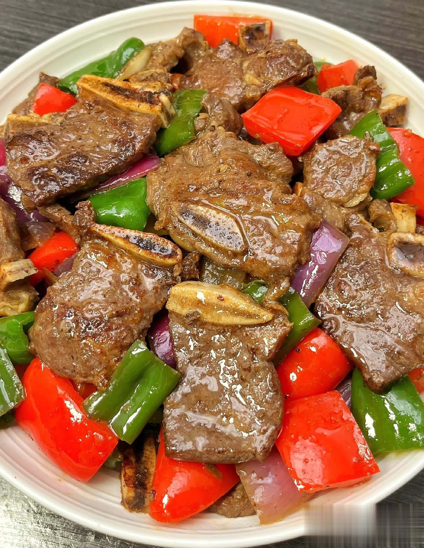 干锅牛仔骨食材:牛仔骨、青椒、红椒、洋葱、葱、姜、蒜、黑椒酱(或黑胡椒粉)、盐