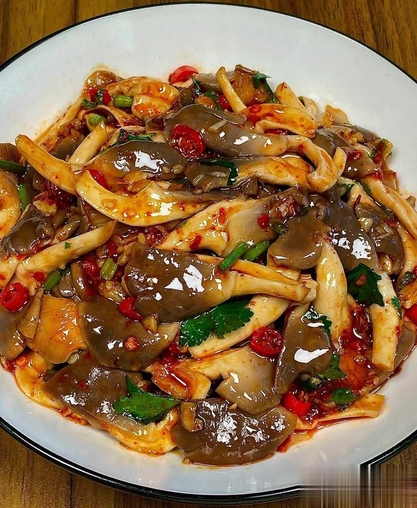 平菇、蒜末、小米辣、香菜、生抽、蚝油、辣椒面