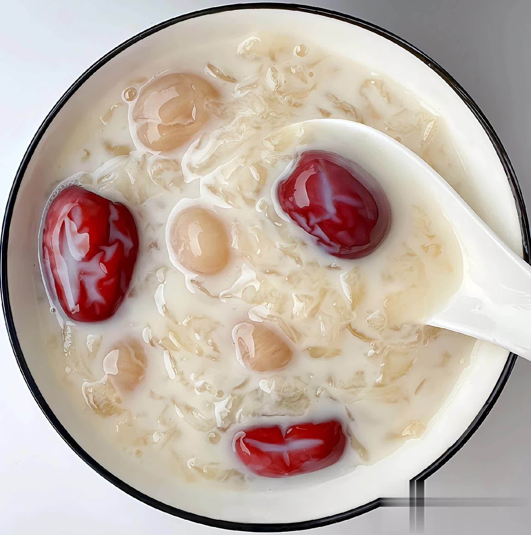 红枣桂圆银耳汤食材:银耳1朵、红枣10颗、桂圆10颗、冰糖适量