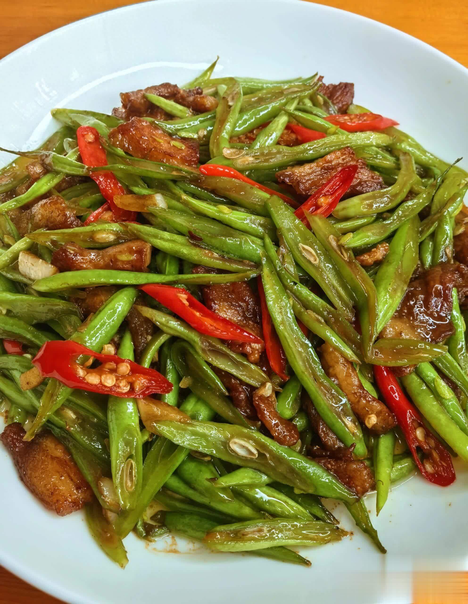 五花肉炒四季豆所需材料:五花肉 200 克;四季豆 300 克;大蒜 3 瓣;生姜 3 片;红辣椒 适量(可选);酱油 适量;料酒 适量;盐 适量;白糖 适量;食用油 适量